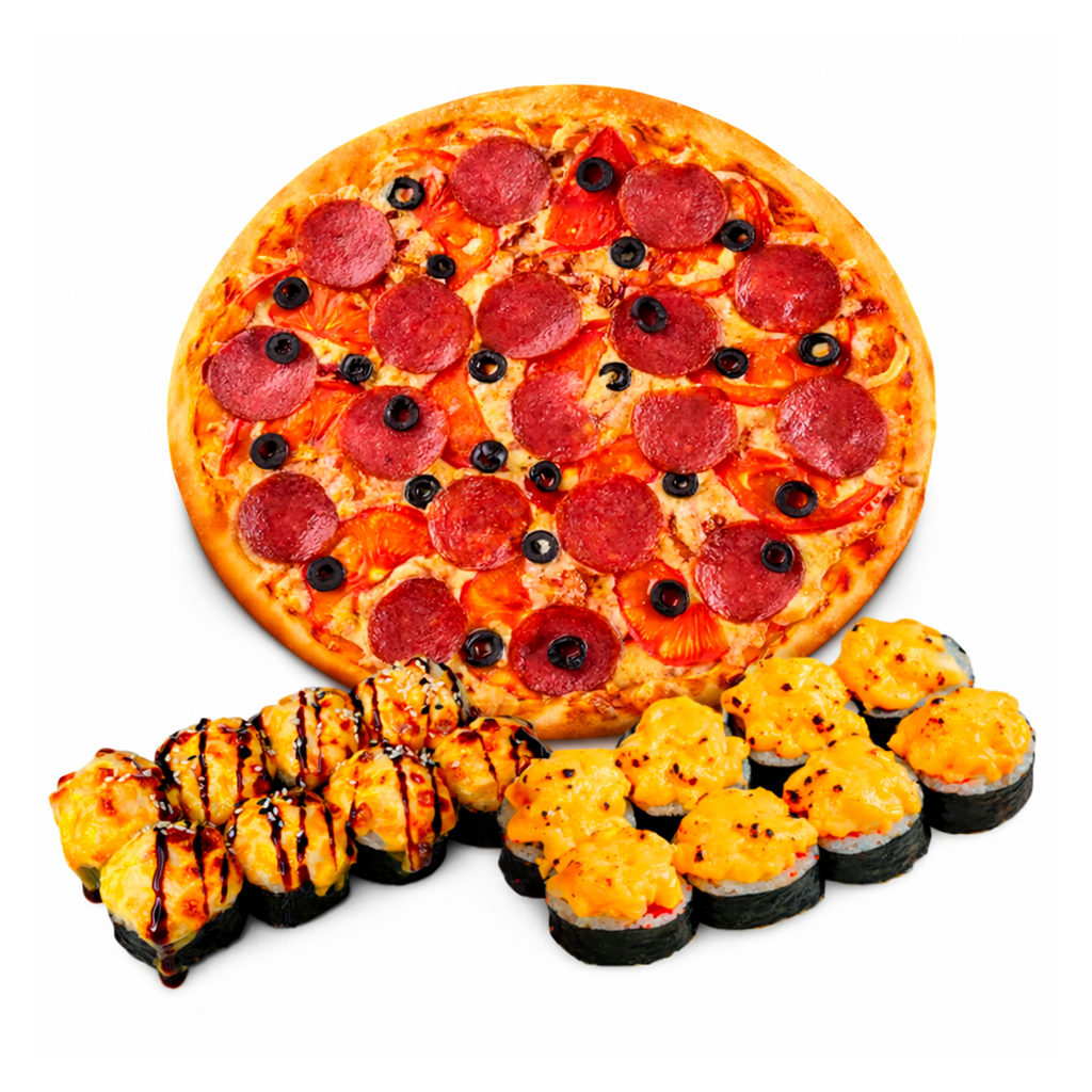 (1175г) Ролл запеченный с креветкой, ролл запеченный с угрем, пицца Пепперони.