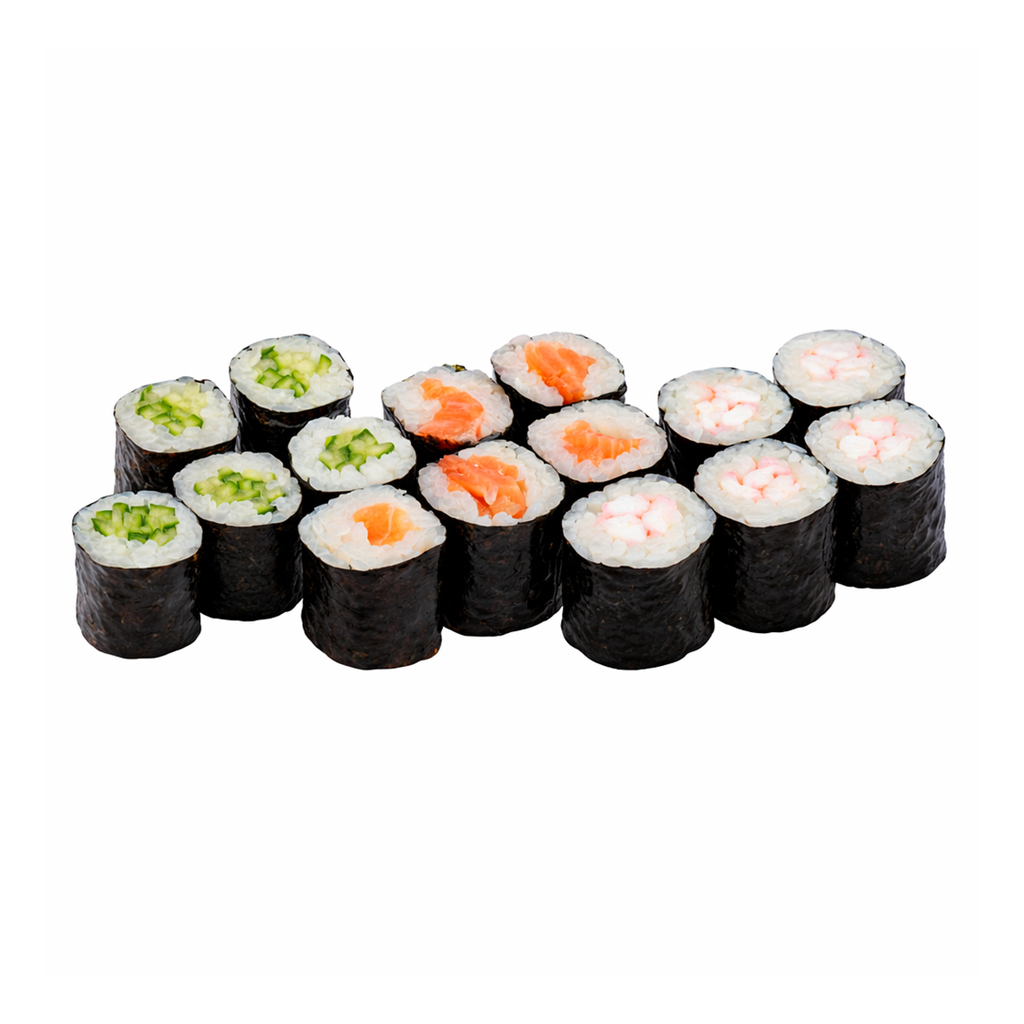 (343г = 18шт) Маки с форелью, маки с огурцом, маки с креветкой.
