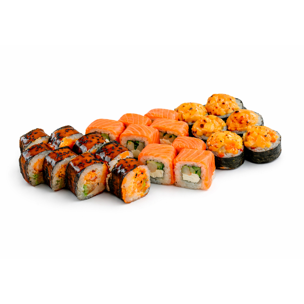 (829г = 24шт) Ролл с креветкой Катаифи, ролл Филадельфия с форелью, ролл запеченный с креветкой.