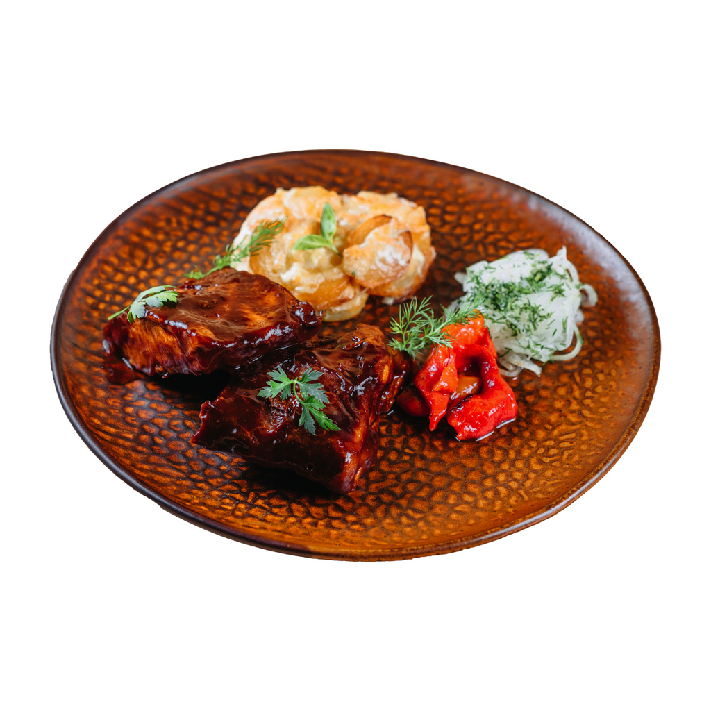 (280/250) Ребра свиные сювид, соус BBQ, картофельный гратен, маринованный лук, перец маринованный, зелень