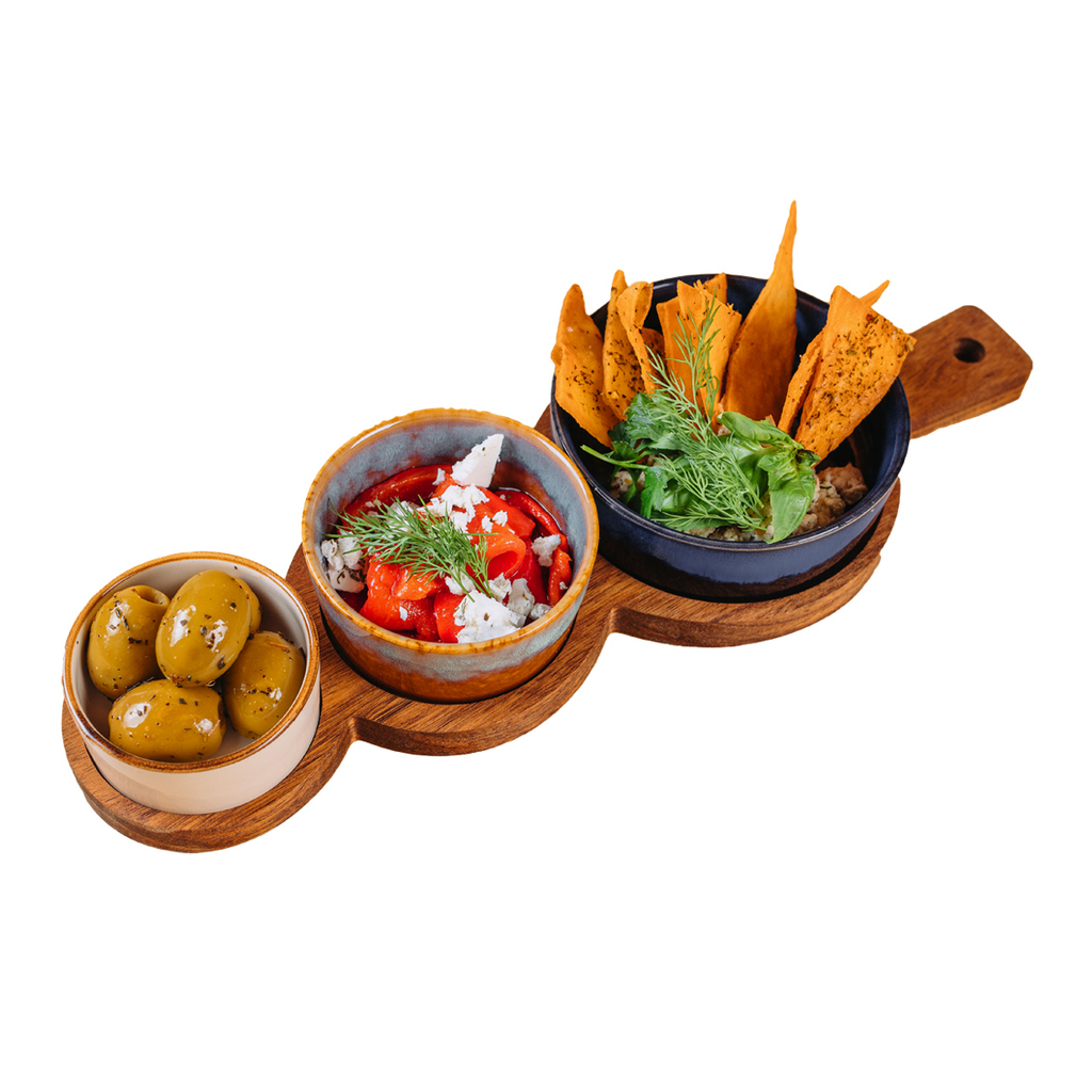 (180) Риет из копченого пеленгаса, чипсы из тортильи, перец маринованный, фета, оливки маринованные, микс зелени
