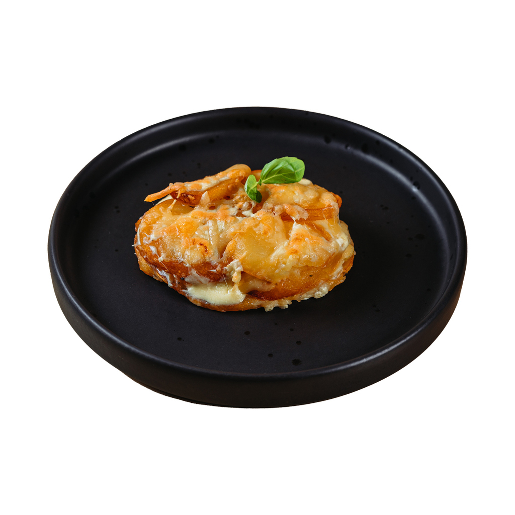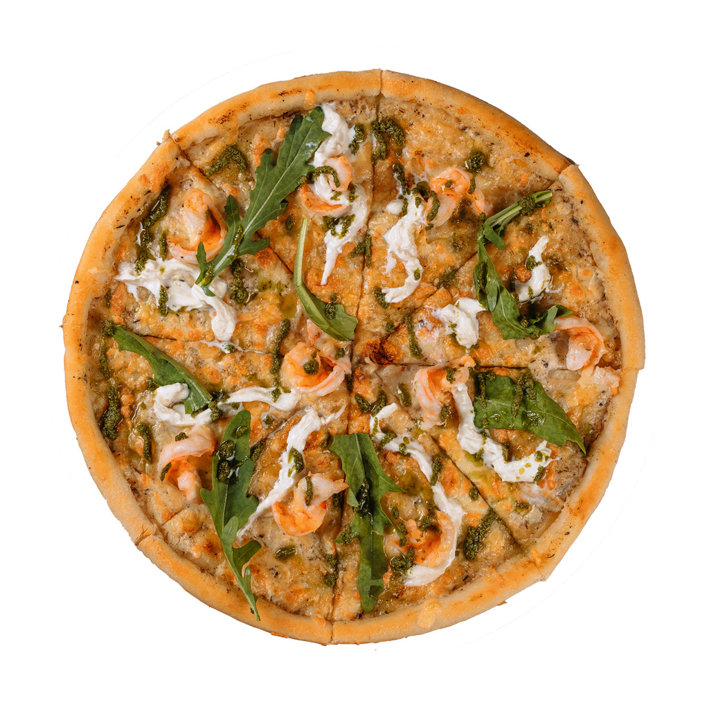(495) Тесто, соус сливочный, миксом сыров, креветки, соус песто, сыр Страчателла, руккола.