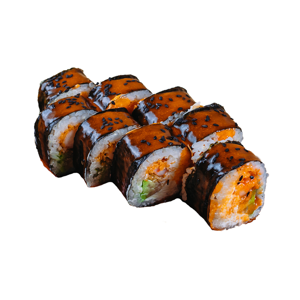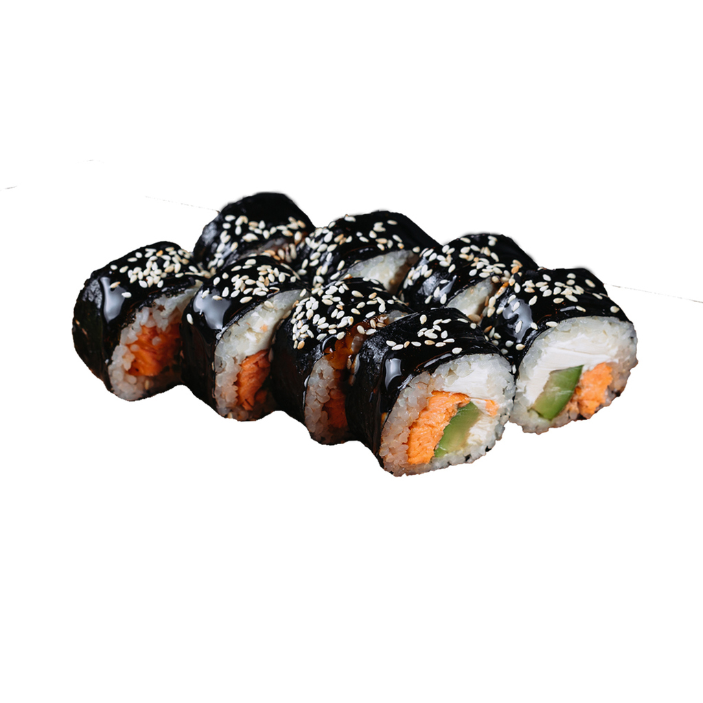 (8шт =245 г ) Рис для роллов, нои, сыр сливочный, авокадо, форель ,запеченная в соусе унаги, соус унаги, кунжут, васаби, имбирь маринованный