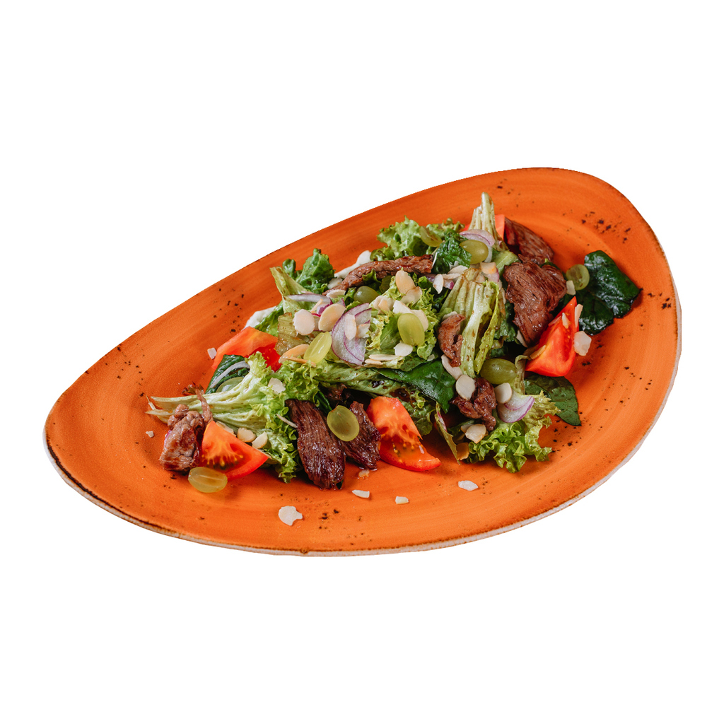 (215) микс салата, руккола, крем бальзамик ЯГОДНЫЙ, масло оливковое, вырезка говяжья,соль, перцем молотый,соус дор блю, помидоры, лук ялтинский соломкой, миндальные лепестки, виноград.