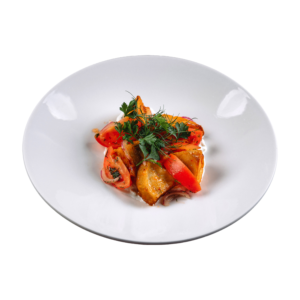 (235) Баклажаны, крахмал, помидор, уксус бальзамик, масло оливковое, лук ялтинский, соус сладкий чилм, страчателла, микс зелени