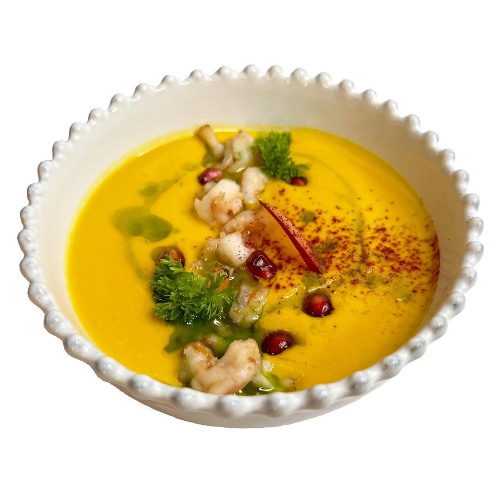 (275) тыква, морковь, лук, имбирь, бульон, кокосовое молоко, креветка, тыквенные семечки, зелень