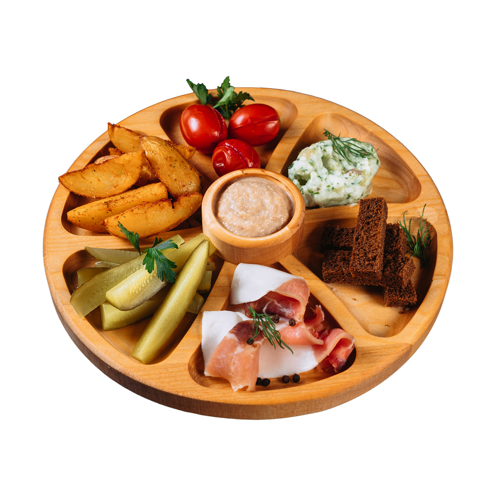 (280) Помазуха, Картофель, сало, помидор и огурец маринованные, хрен, гренки из черного хлеба, микс зелени