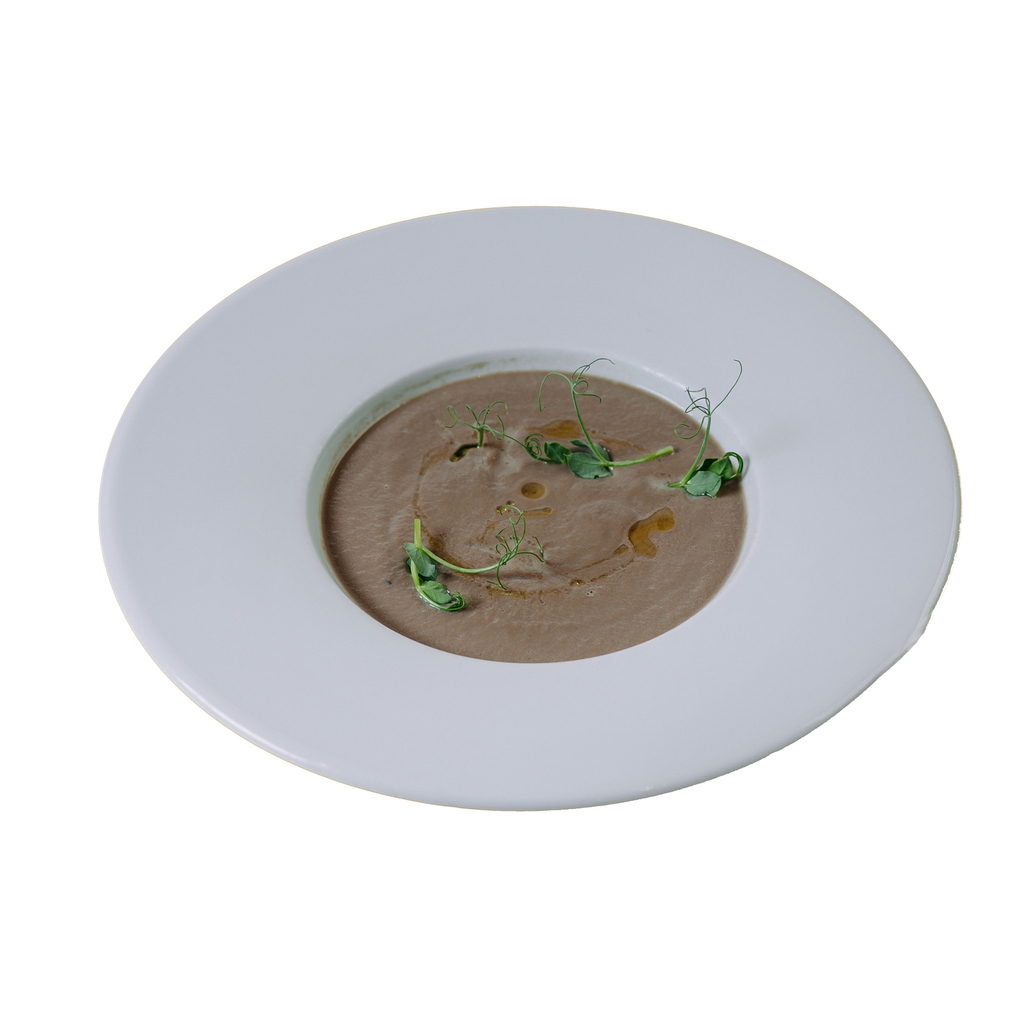 (200/40г) шампиньоны, лук, сливки, куриный бульон, трюфельное масло, зелень, тостики с грибным маслом