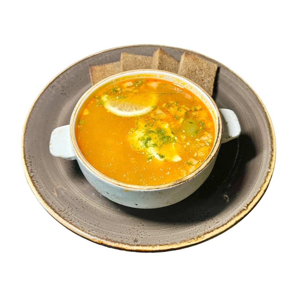 (355/40г) куриный бульон, колбаса Пепперонни, куриные колбаски гриль, бекон, куриное филе и бедро,ветчина, каперсы, соленые огурцы, лук,томат,чеснок, масло растительное, специи, оливки, сметана, лимон, тосты из бородинского хлеба с чесноком