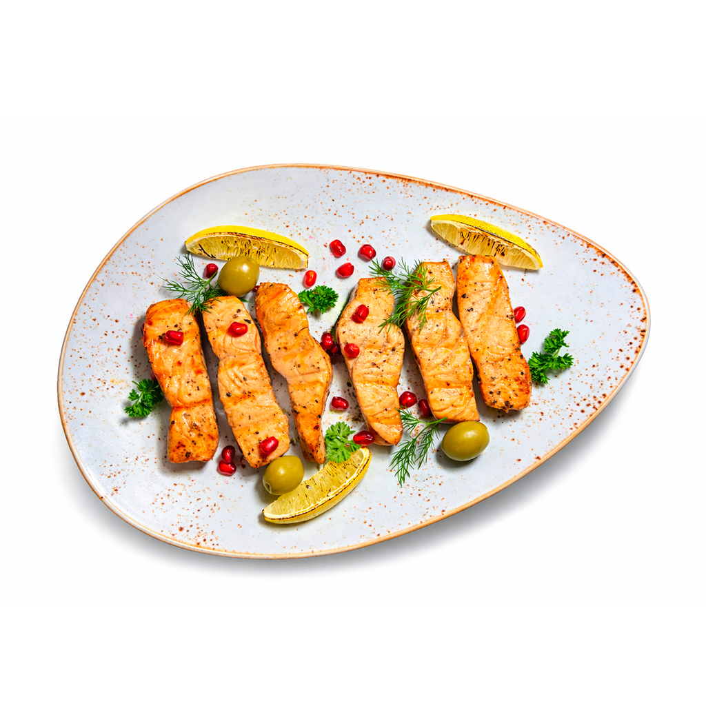 (400/80) Стейки форели, оливки маринованные, лимон,гранат, петрушка.