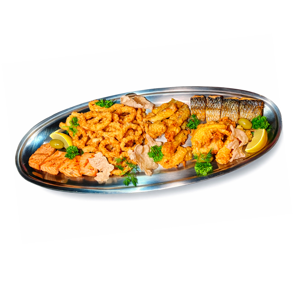 (810/135) Пеленгас филе, кольца кальмаров, стейк форели, креветка Панко, барабулька фри, оливки маринованные, лимон, петрушка.