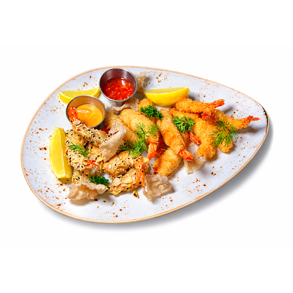 (400/62) Креветки Панко, креветки Катаифи, креветки в миндально- кунжутной панировке, соусы Спайси и Сладкий чили, лимон, петрушка.