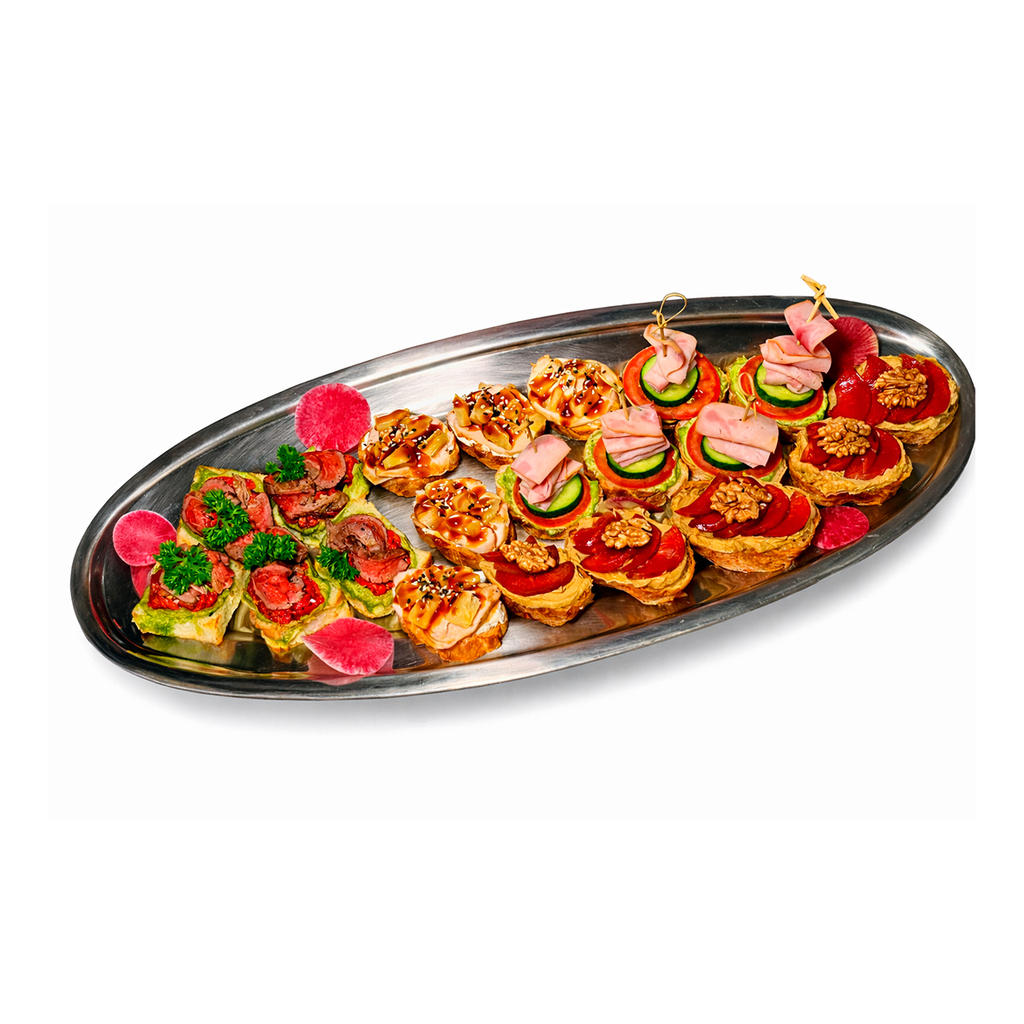 (1435г) брускетты с паштетом и бруснично-вишневым соусом, ролл Терияки с курицей, ролл с креветкой и авокадо, нигири с форелью, тарталетки с форелью и сливочным сыром.